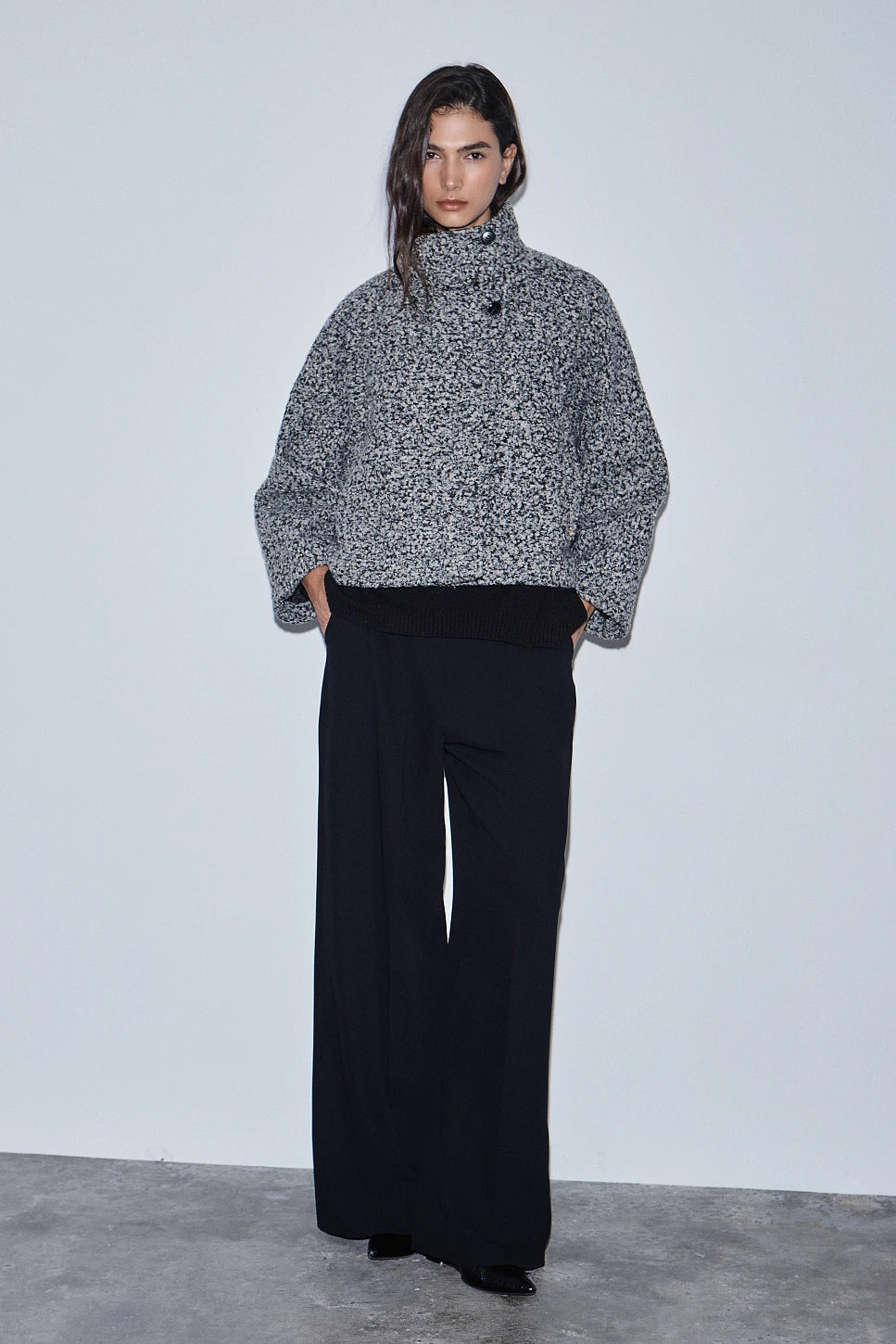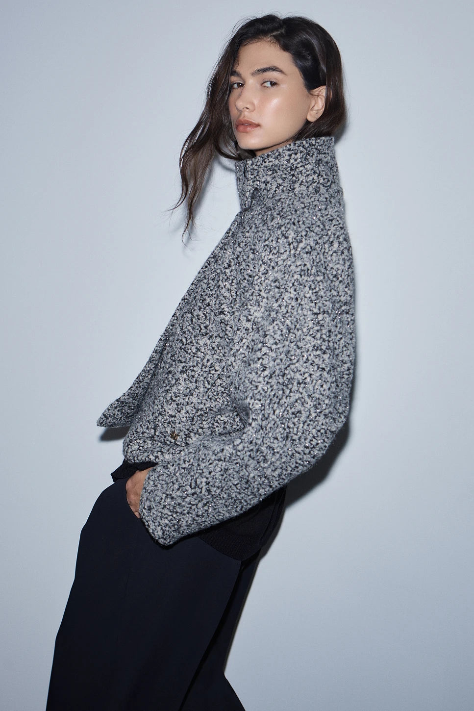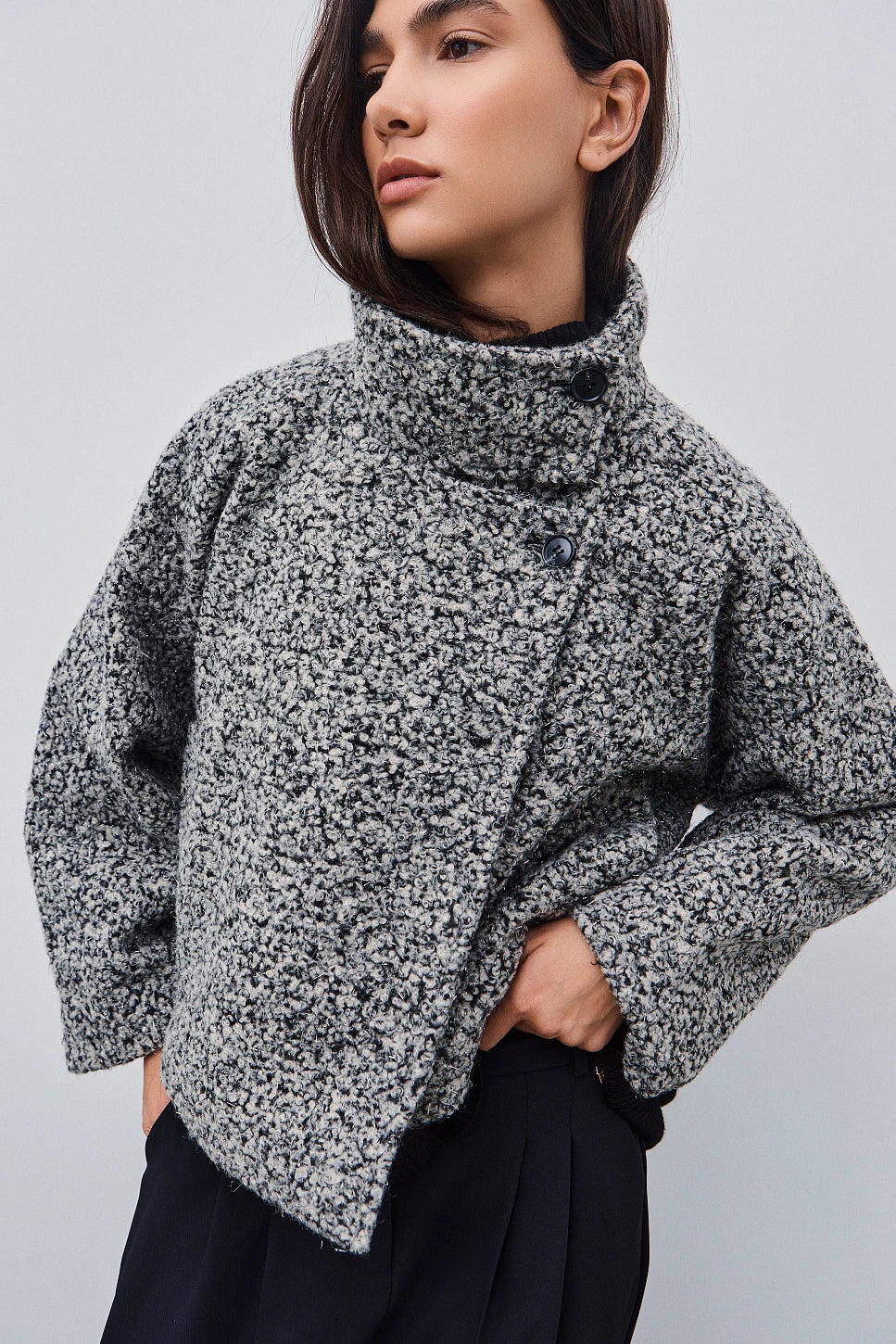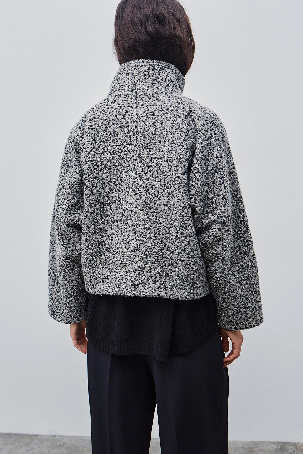 Abrigo corto efecto borreguito en color crudo con cuello alto y textura suave. Una prenda envolvente y ligera que combina calidez y estilo. Su diseño minimalista y su acabado esponjoso lo convierten en un básico moderno para los días fríos.