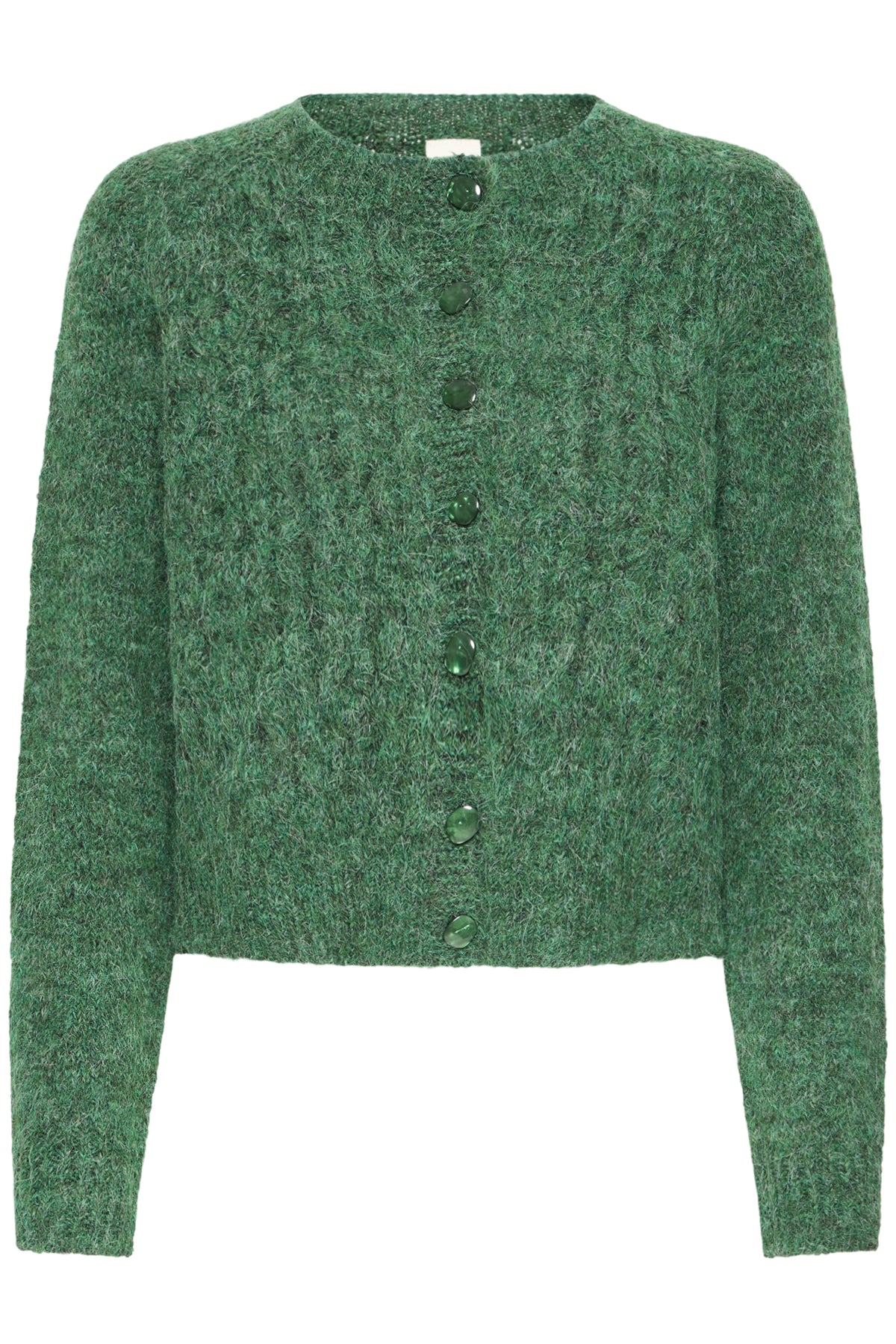 Cárdigan corto de punto trenzado de ICHI. Confeccionado en un tejido cálido y elástico, combina textura, comodidad y un diseño clásico con botones al frente. Su corte ligeramente ajustado lo convierte en una prenda versátil para llevar abierta o cerrada sobre camisas, vestidos o tops.