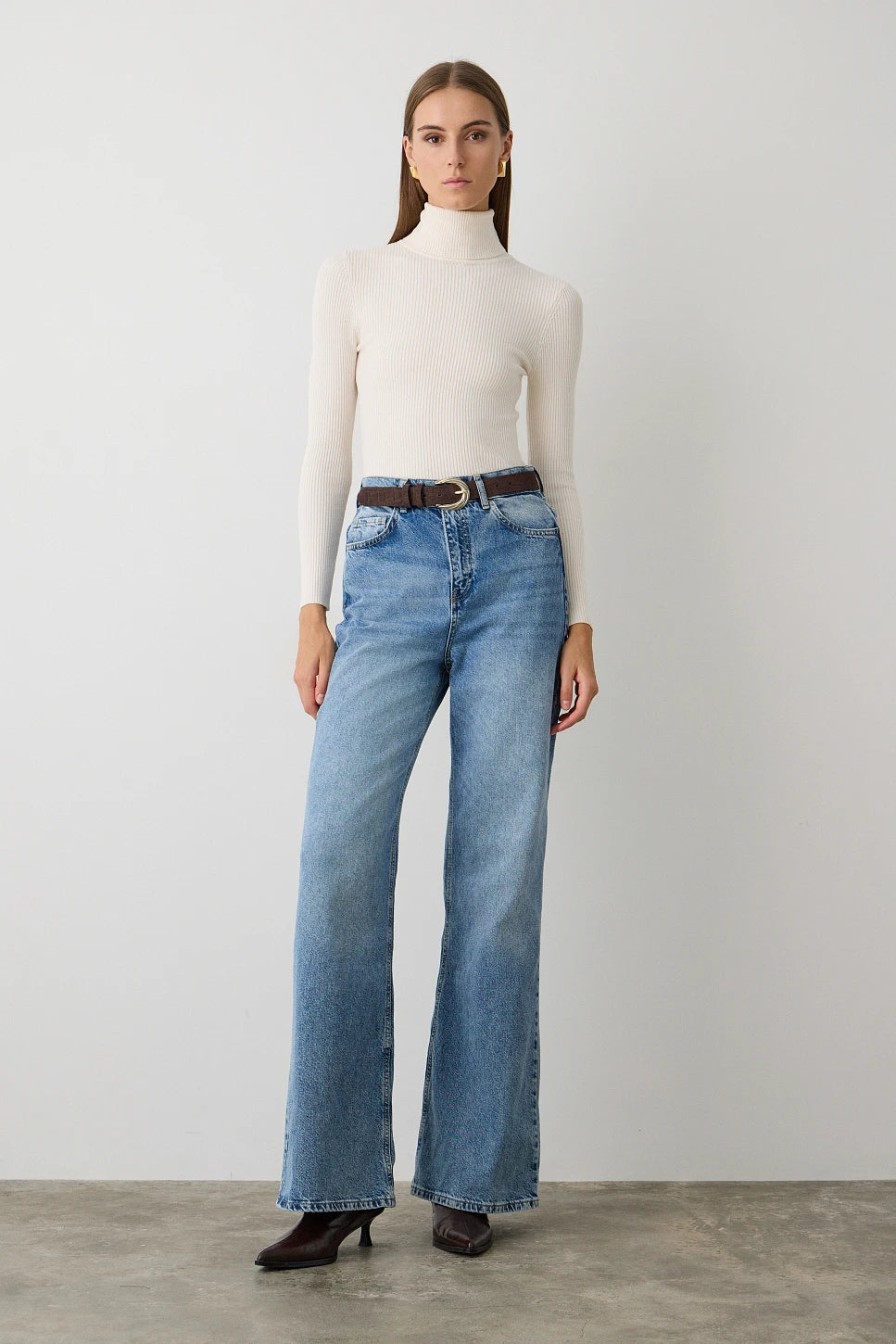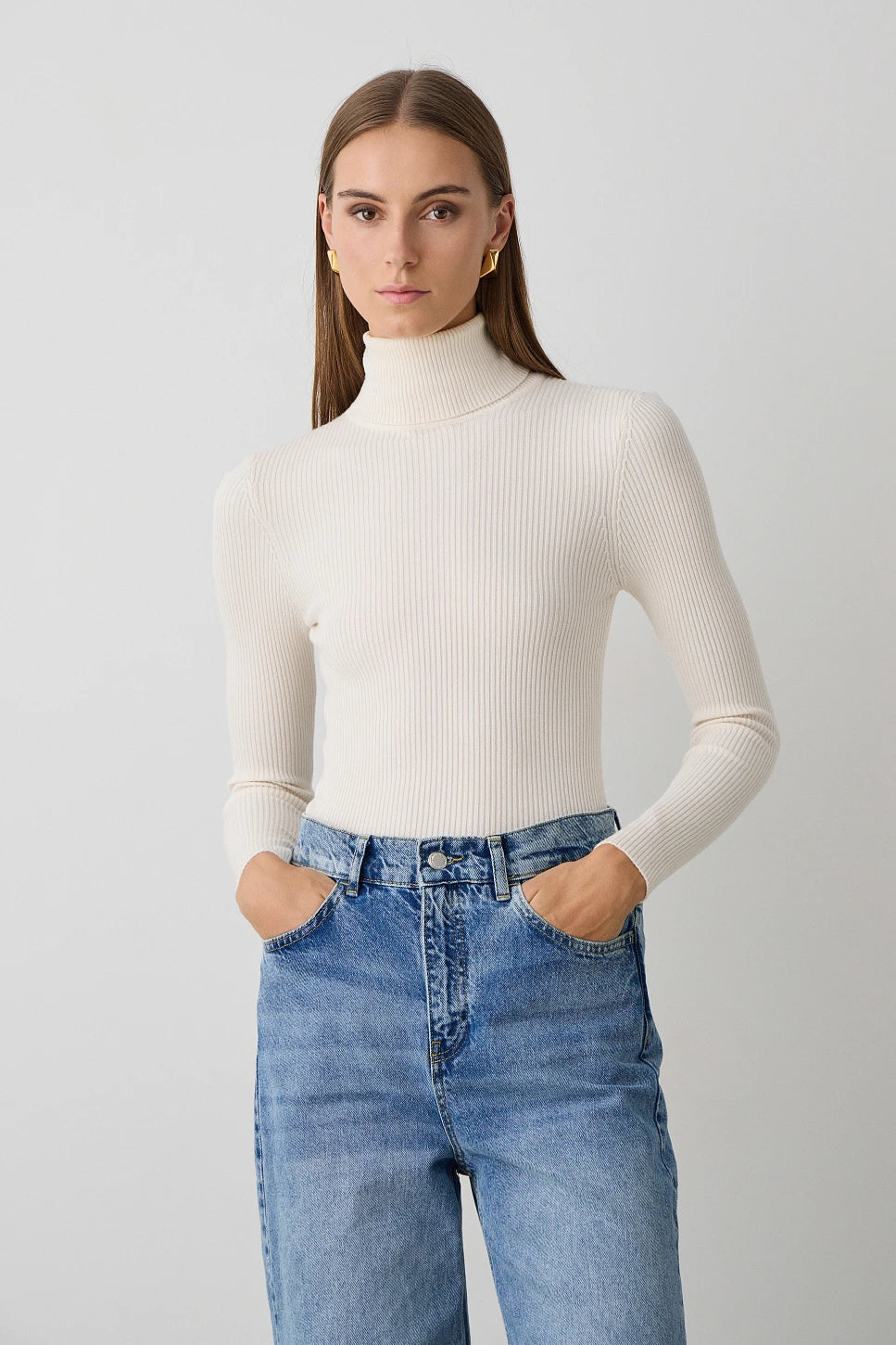 Jersey de punto canalé con cuello alto, diseñado en tejido elástico y tacto suave. Una prenda básica y versátil que aporta calidez sin renunciar a la ligereza, perfecta para combinar con faldas, pantalones o bajo blazers.
