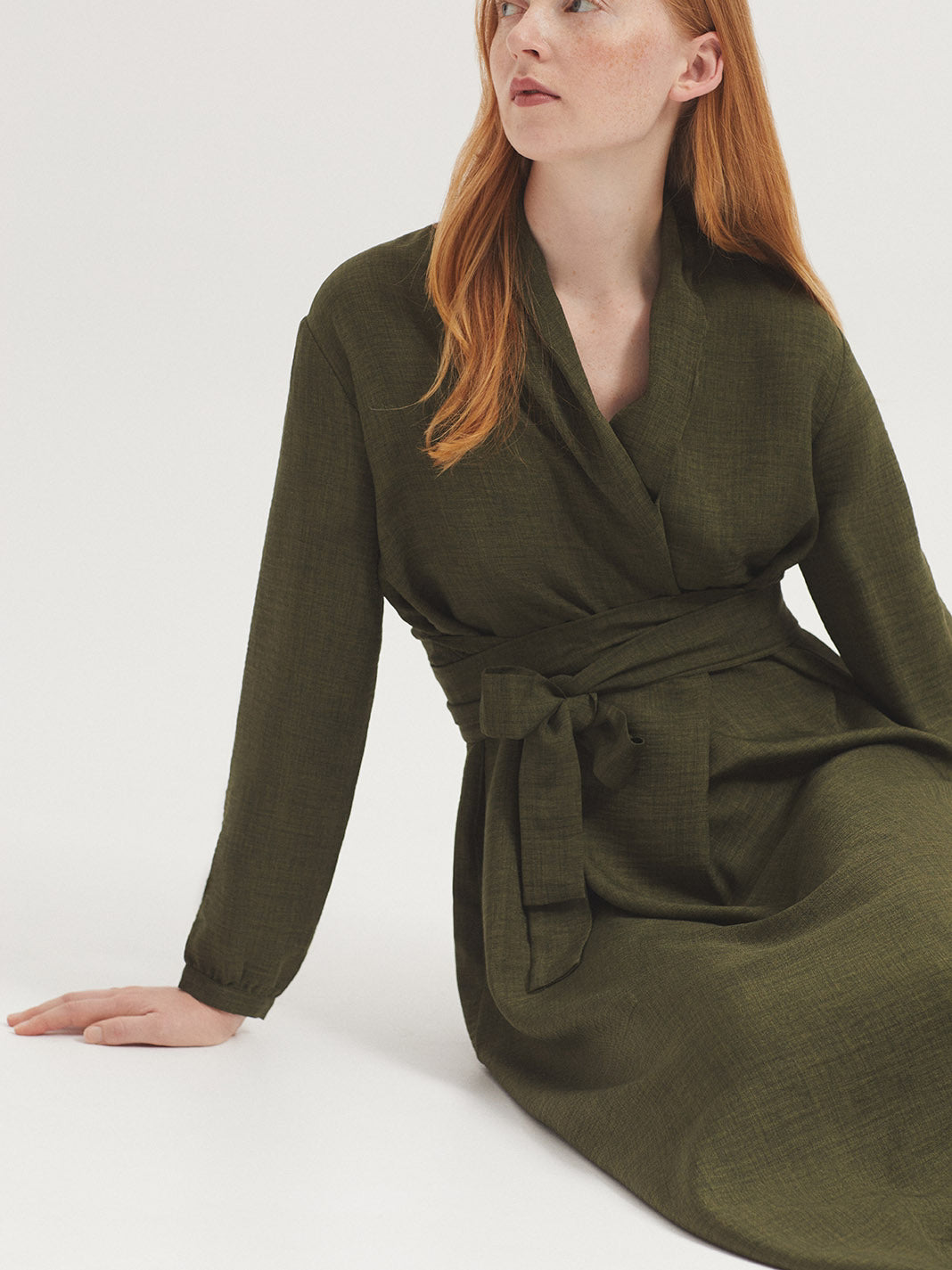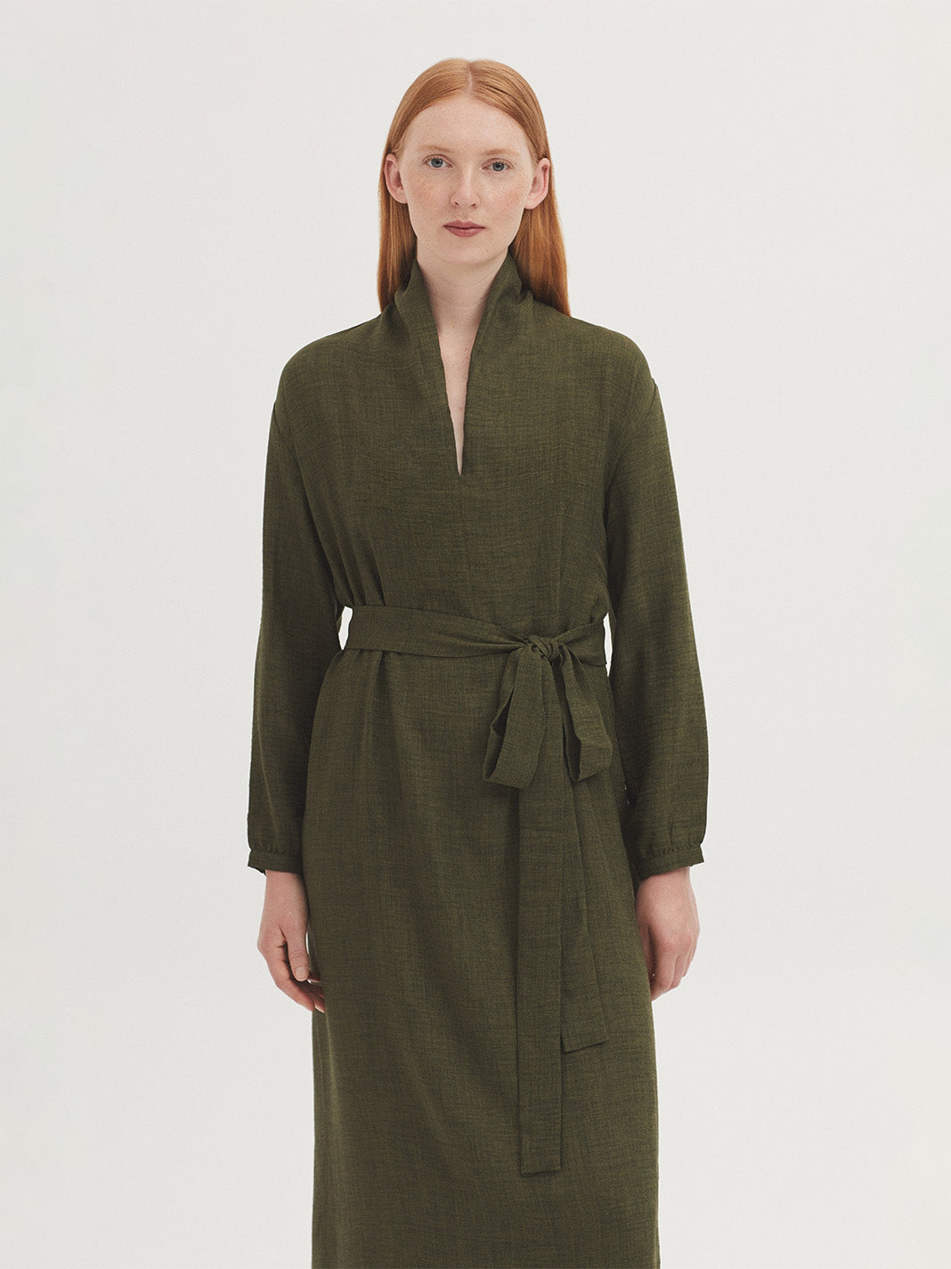Vestido midi en tejido melange con caída suave. Escote en pico y ajuste en la cintura mediante lazadas del mismo tejido para estilizar la silueta. Una prenda versátil y cómoda para el día a día con un punto elegante.